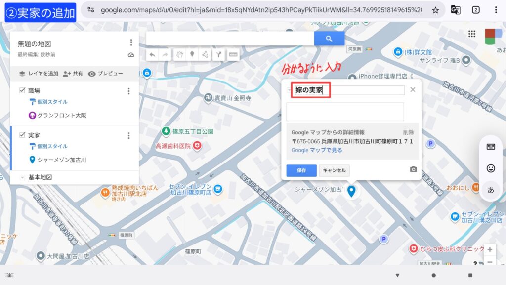 夫の職場が入れ終わったところで、同じ要領で実家も追加していきましょう!