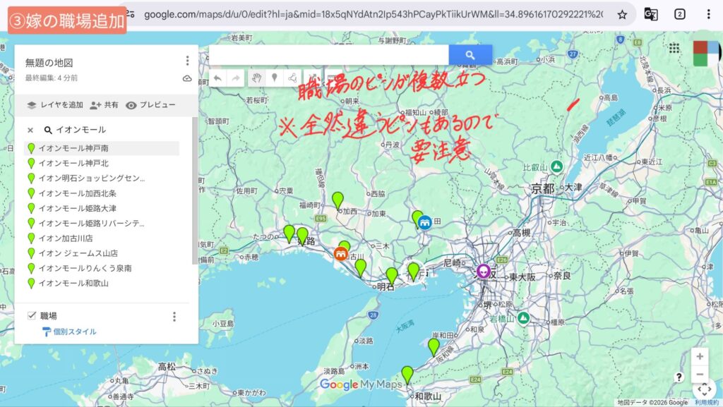 | 職場(点) | 大阪梅田駅(グランフロント) ⇒1か所 | イオン系列店 (今回はイオンモールに) ⇒複数店舗あり |
