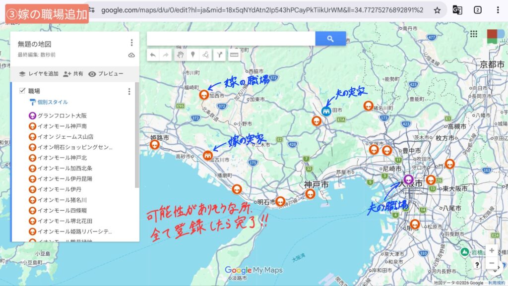 どちらもGoogleマイマップで好きにカスタマイズし、自分の望む環境を考えてみましょう!