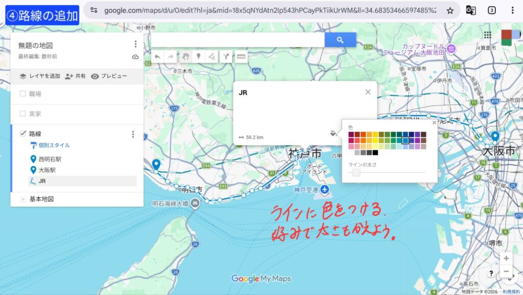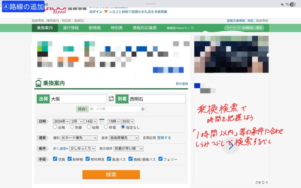 Yahoo!路線情報で乗車時間を調べ、路線に沿ってラインを引きましょう。