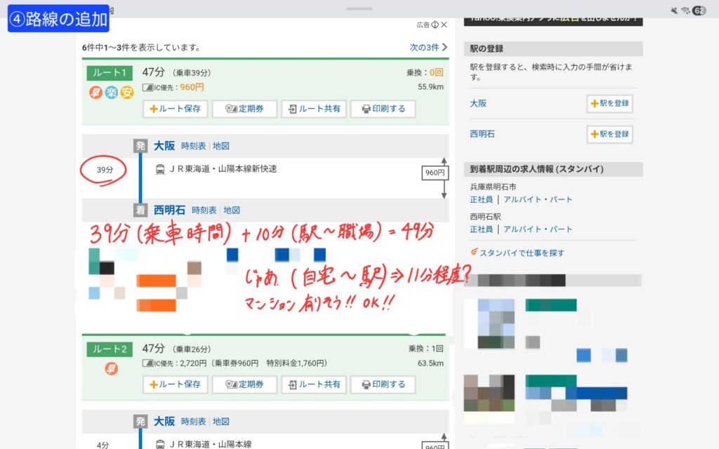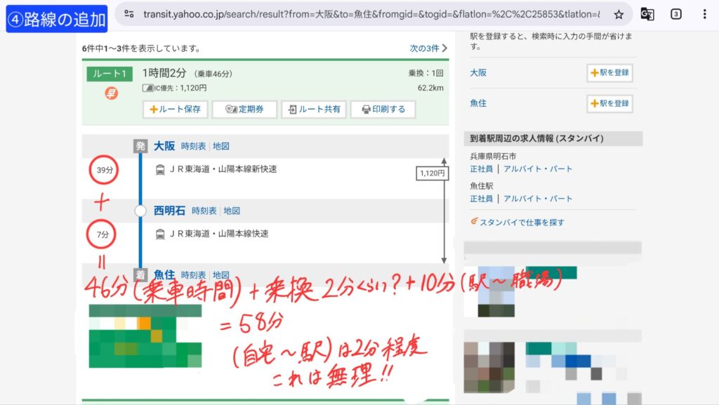 ここでポイント!駅から職場、駅から自宅までの徒歩時間も含めておこう!その方が自分への納得度が上がり、ストレス軽減になるよ!