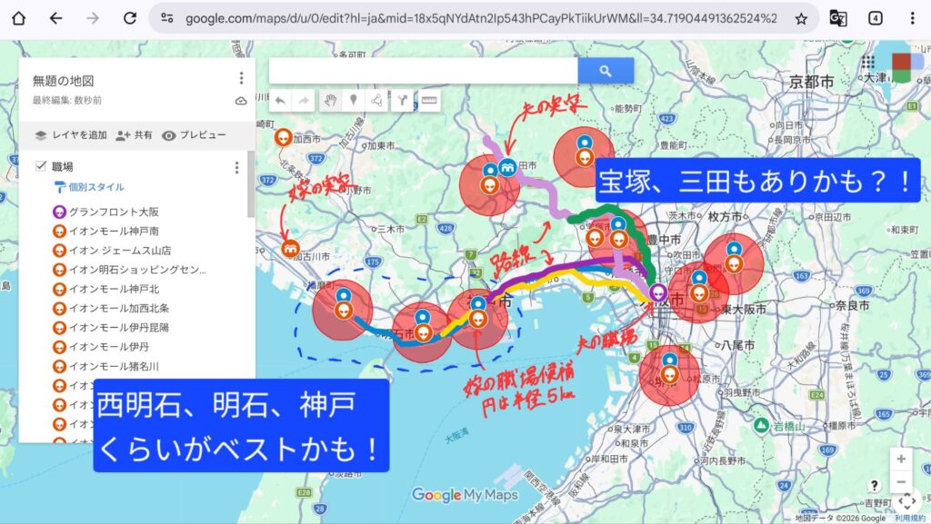 次回、より詳細にエリアを選ぶために、円を重ねて住むべき場所をより炙りだそうと思います
